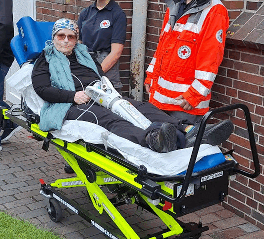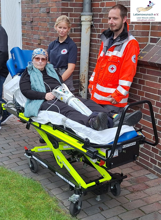 August 1, 2025Am späten Nachmittag des 17. Juli erreichte uns die Information, dass Frau M., die austherapiert sei und bereits als Palliativpatientin für die Aufnahme im Hospiz angemeldet war einen dringenden Wunsch hatte. Denn bereits am Folgetag würde die Beisetzung ihrer Mutter in Wilhelmshaven stattfinden, an der sie unbedingt teilnehmen wollte. Es wurde ein regelrechter Wettlauf gegen die Zeit. Noch am selben Abend nahmen wir Kontakt zu unseren Netzwerkpartner des DRK auf, da ein Liegendtransport mit Sauerstoffversorgung benötigt wurde. Am nächsten Morgen stand das Herzenswunsch-Hospizmobil parat. Damit fiel uns und vor allem Frau M., ihrem Ehemann und den Pflegefachkräften des Delme-Klinikum ein großer Stein vom Herzen. Vom Ehemann erhielten wir ein paar Tage später dieses Foto.