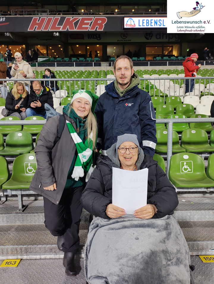 Dezember 29, 2025Anfang Dezember erfuhren wir aus dem Hospiz Brücke in Bremen, dass Frau J. (76 Jahre) so gern zusammen mit ihrer Tochter ein letztes Mal ihren SV Werder im Weserstadion spielen sehen wollte.