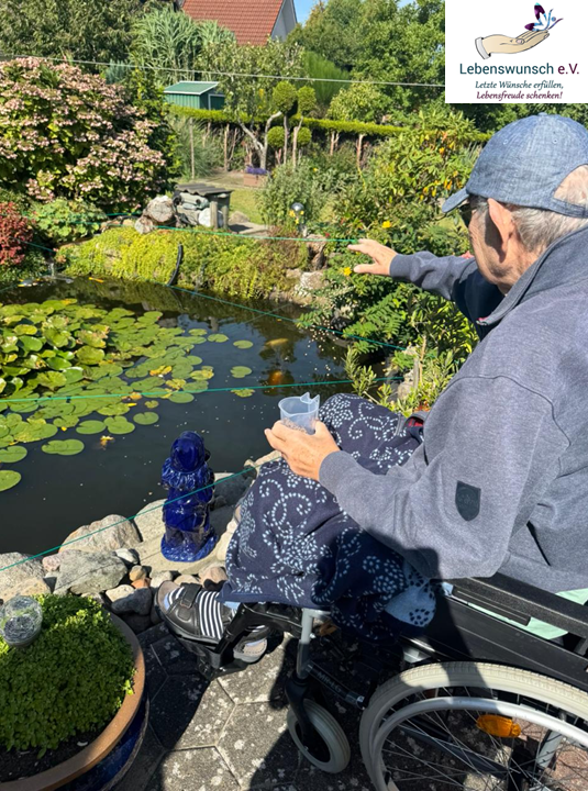 September 30, 2025Herr S. (83) hatte eine wahre Odyssee hinter sich, bis er als Gast ins schöne Haven-Hospiz in Bremerhaven zog. Zuvor war er plötzlich von zu Hause in ein Krankenhaus und von dort aus direkt in ein Pflegeheim verlegt worden. Er hatte keine Zeit, sich von seinem Garten und den geliebten Fischen im Teich zu verabschieden. Eine Enkeltochter berichtete uns davon und wir zögerten keine Sekunde. Noch am Abend unserer Anfrage konnten der DRK-Kreisverband Bremerhaven das Herzenswunsch-Hospizmobil für zwei Tage mit ehrenamtlichen Fachkräften besetzen. Herr S. war sehr glücklich, dass er nun doch noch einmal nach Hause kommen würde und sich von seinem Garten und den Fischen verabschieden konnte. Zusammen mit seiner Familie genoss er einen wunderschönen Nachmittag bei Kaffee und Kuchen. Wie erhofft, konnte er mit seiner Ehefrau ein letztes Mal die Fische im Teich füttern. Zufrieden kehrte Herr S. ins Haven-Hospiz zurück.
