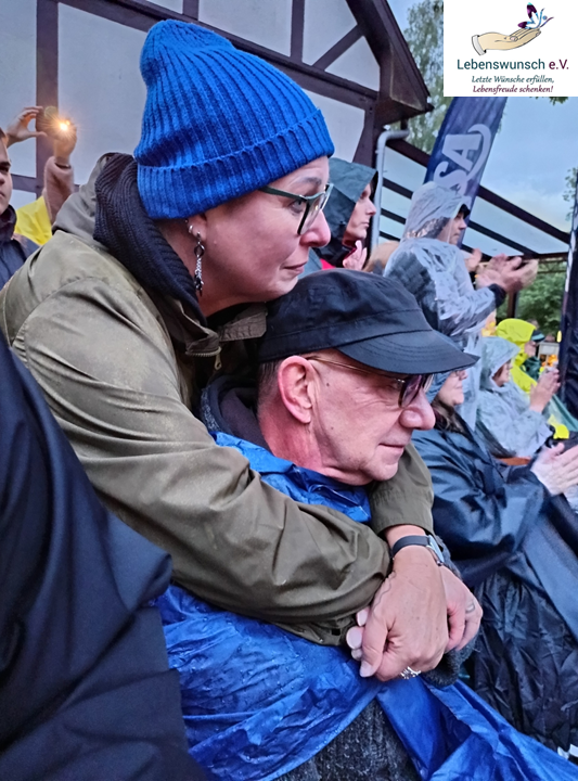 Juni 28, 2025Herr B. (62) war Gast im Laurentius-Hospiz in Ganderkesee. Bereits vor längerer Zeit hatte er Konzertkarten für sich und seine Frau gekauft. Geplant war gemeinsam der wunderbaren Stimme von Rea Garvey live in seinem Heimatort Bassum zu lauschen. Ohne Hilfe und Begleitung schien ein Konzertbesuch jedoch nicht möglich zu sein. Wir haben sofort zugesagt zu helfen. Am Tag des langersehnten Konzerts holte unser Wunscherfüller Mark Castens Herrn B. ab und begleitete ihn zum Veranstaltungsort, wo seine Frau schon wartete. Der strömende Regen konnte der guten Stimmung nichts anhaben. Zusammen erlebten sie einen unvergesslich schönen und unbeschwerten Abend, an dem auch Pommes, Wurst und Bier nicht fehlten. Ob sie den Sänger vorab noch persönlich trafen, bleibt wohl ihr Geheimnis.