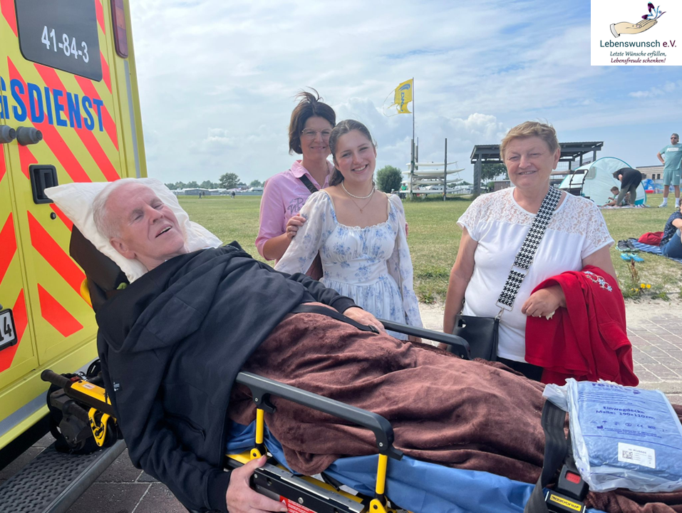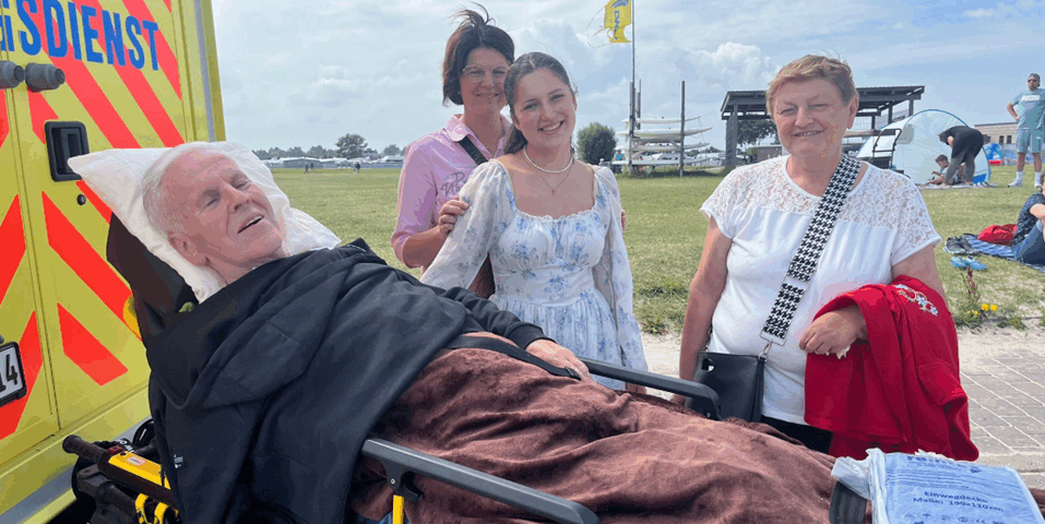 September 12, 2025Vom Friedel-Orth-Hospiz aus Jever erfuhren wir, dass Herr N. (75) gern bei dem schönen Wetter mit seiner Familie an den Sandstrand von Schillig wollte. Aufgrund seiner Erkrankung wurde ein Liegendtransport benötigt und wir nahmen daher rasch den Kontakt zu unserem Netzwerkpartner dem DRK-Kreisverband Wesermarsch e.V. auf. Parallel telefonierten wir mit der Ehefrau und erfuhren, dass auch die Enkeltochter aus Bayern, diesen besonderen Ausflug begleiten möchte und dafür eigens anreisen würde. Direkt nach dem Telefonat bekamen wir die Rückmeldung, dass das Herzenswunsch-Hospizmobil bereitstand. Nachdem wir auch die Zufahrt zum Sandstrand über den dortigen Campingplatz organisieren konnten, stand der Wunscherfüllung nichts mehr im Wege. Bei sonnigem Wetter konnte Herr N. mit seinen Liebsten einen schönen Platz in der 1. Reihe mit Blick auf die See einnehmen. Die Nordsee sorgte mit Hochwasser und ihrem salzigen Duft für eine schöne Meereskulisse.